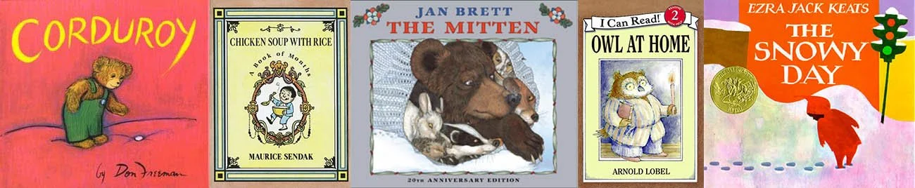 Chicken Soup with Rice, by Maurice Sendak: A series of rhymes for each month of the year, written and illustrated by the peerless Maurice Sendak. Each rhyme focuses on the eponymous soup; the rhymes for January, February, March, November and December highlight snowy, blustery weather and holiday themes, and each month has its own quirky energetic illustrations. The book was turned into a song by the equally peerless Carole King.